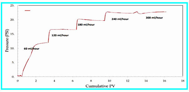 The injectivity test for PolyPAM formulation shows high flowrates without fluctuating pressure. The polymer uniform structure due to controlled polymerization ensures smooth flow, no pressure fluctuation, and well-maintained permeability without blocking (exhausting) the pores.