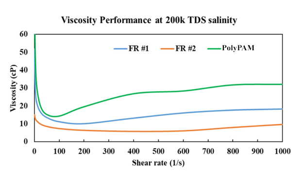 PolyPAM UHMWPAM formulations achieved exceptional friction reduction of over 70% in a high brine solutions of 225k TDS, using very dilute loading of 0.1 kg/m3. These formulations also achieved excellent dissolution properties, reaching full solubility within a minute.